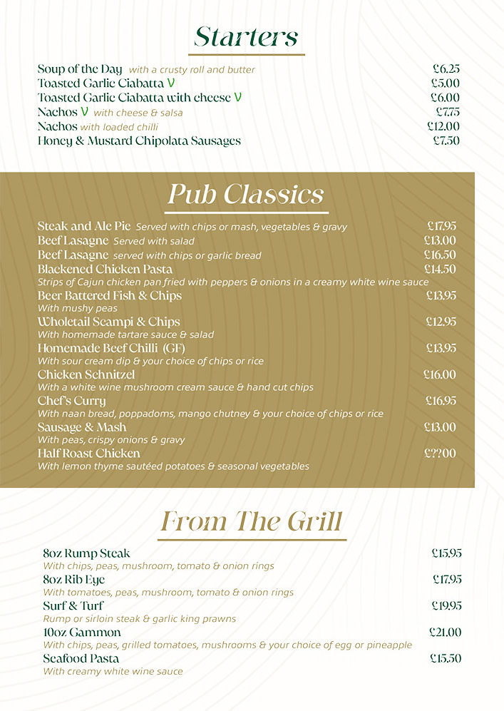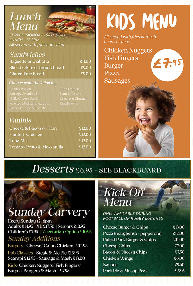 Food is served daily from 12 noon until 9pm (6pm Sundays) and you can expect traditional pub grub alongside Daily Specials and a ‘Magnificent 7’ offer for smaller appetites. The pies here are legendary, as is the Sunday Carvery, and for drinkers there are four cask ales plus a choice of wines and gins.
